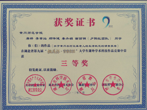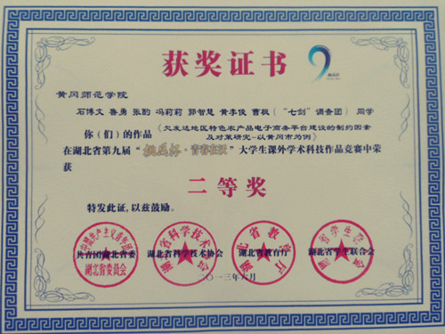 由我院刘汉成教授指导的“七剑”调查团的《欠发达地区特色农产品电子商务平台建设的制约因素及对策研究-以黄冈市为例》获二等奖,王庆老师指导的“夕阳红”团队的《关于黄冈农村空巢老人的生活状况的调查报告》获三等奖。全校获奖总额共6项,我院获奖总额占三分之一,此次大赛开创了我院科技类竞赛作品的先河。