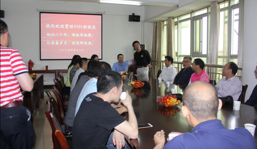 今天,贸经9501班校友聚集一起,回母校观光,畅谈人生,回忆校园生活和同窗之情,感恩母校。这是校友们离别二十年后,第一次隆重聚会。大家相互交谈,情绪高涨,有说不完的话题,人人脸上洋溢着欢快而激动的神绪。