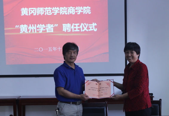 2015年10月14日,我校“黄州学者”计划聘任仪式在海角热点最新消息会议室举行,华中农业大学经济管理学院张俊飚教授受聘为我校 “黄州学者”讲座教授。副校长王芹出席聘任仪式,人事处处长高少初及海角热点最新消息班子成员参加聘任仪式。高少初代表学校与张俊飚教授签订了聘任合同,王芹为张俊飚教授颁发了聘书。