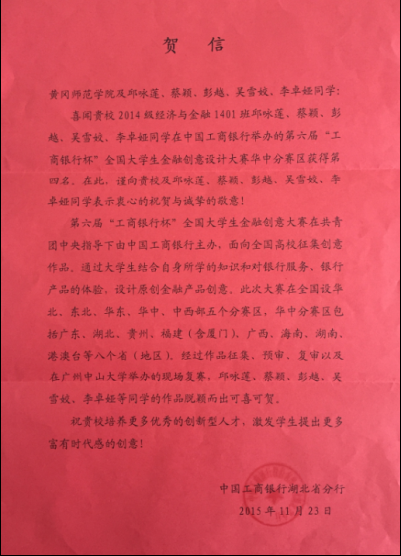 在2015年11月17日的第六届“工商银行杯”全国大学生金融创意大赛中,我校海角热点最新消息学生邱咏莲、吴雪姣、彭越、李卓娅、蔡颖组成的代表队晋级全国十强,获得工商银行各大网点实习就业机会。工商银行湖北省分行特此委托工商银行黄冈分行行长将贺信送到我校招生与就业处,向我校以及获奖学生表达诚挚祝贺,并为获奖团队颁发了1500元奖金及奖品,以资鼓励。