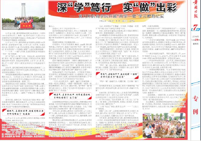 12月29日,《黄冈日报》专版报道我院2016年开展“两学一做”学习教育活动纪实。报道图文并茂,从“接地气:在学和讲中,激发思想活力,老师们明白了‘我是谁’”、“树正气:在查和改中,补齐发展短板老师们懂得了‘为了谁’”、“有底气:在做和评中,盘活发展“一盘棋”老师们找到了‘依靠谁’”三个层面全面报道我院党员实干有为的精神风貌和动人风采,充分反映了我院“两学一做”的阶段性成果。展示了我院始终高举旗帜、牢记使命、昂首向前,为推进学校建设特色鲜明的应用型高水平综合性大学,服务黄冈双强双兴,决胜全面小康,贡献应有的忠诚、担当、奉献、作为!