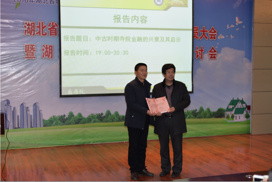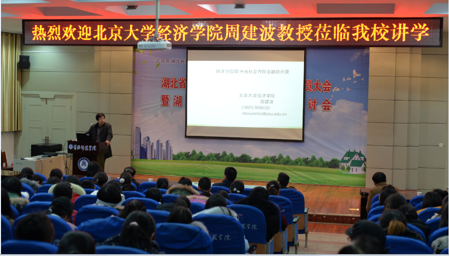 2017年1月11日晚上,北京大学经济学院周建波教授应我院邀请在南区学术报告厅B03作了一场题为《经济与信仰:中古时期寺院金融的兴衰及其启示》的学术报告。院长刘汉成出席了学术报告会并为周建波教授颁发了我校客座教授聘书,院长助理柯珍堂主持学术报告会。