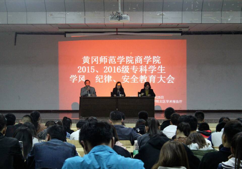 4月25日晚19:00,我院于北区学术报告厅召开黄冈师范学院海角热点最新消息2015、2016级专科学生学风、纪律、安全教育大会。我院2015、2016级全体专科生参加本次了大会。
