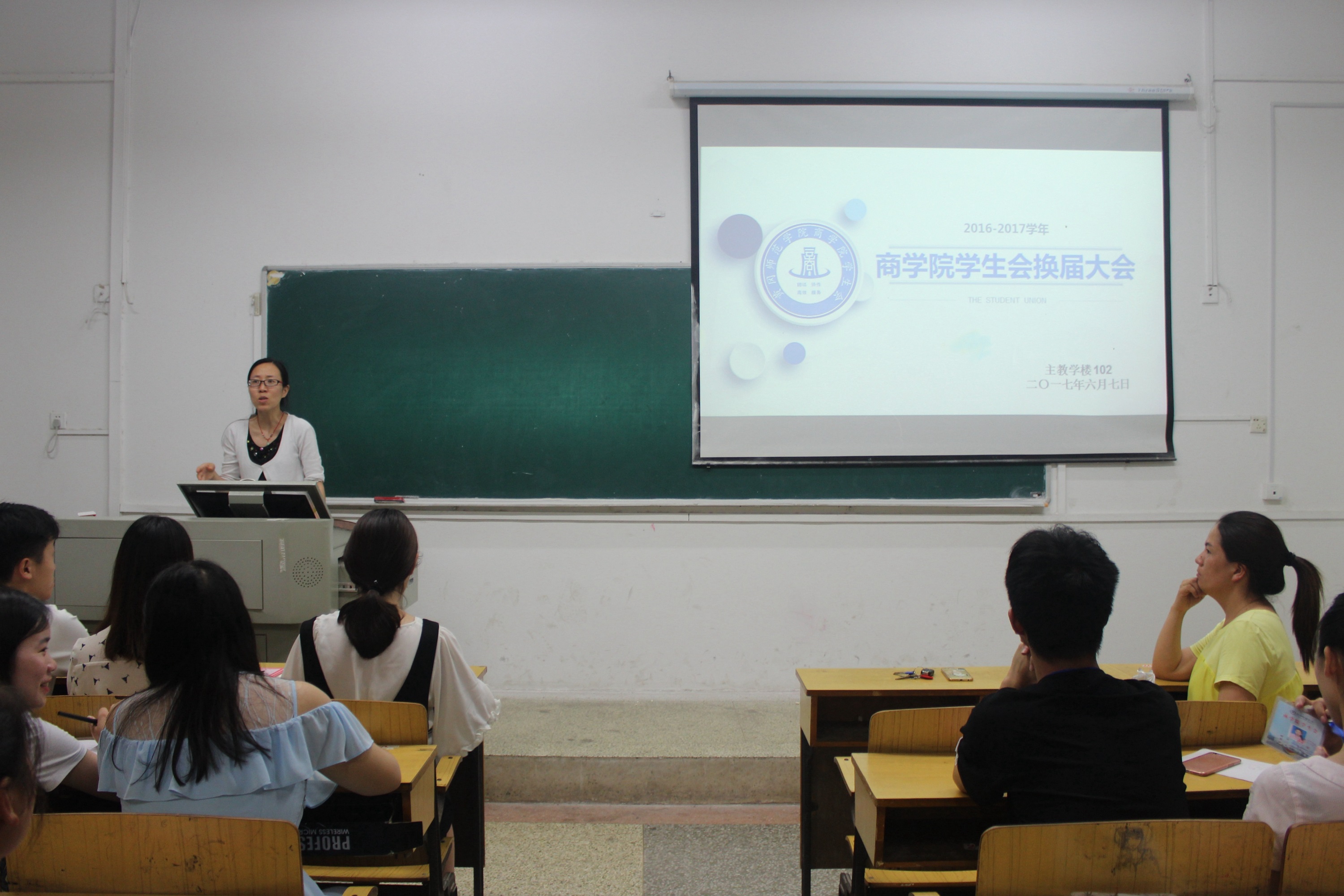 6月7日晚19:00,我院2017年学生会换届大会在南区主教102举行。海角热点最新消息党总支副书记余晚霞,辅导员张丽、张苏明,全体学生会成员以及我院辩论队、主持队、舞蹈队、学生党支部等成员参会,团总支副书记刘兢�主持本次大会。