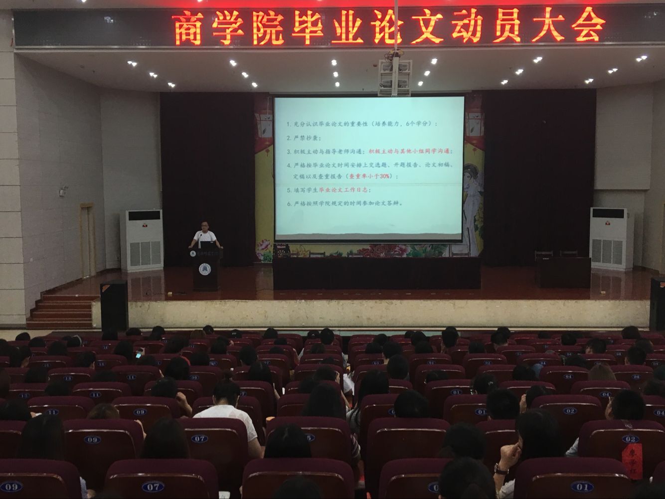 6月21日,学院在校千人报告厅召开2019届毕业论文动员大会。2015级全体本科生参加报告会。