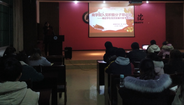 12月06日下午,为使我院入党积极分子了解和熟悉发展工作流程,学生党支部书记程惠以《确定学生党员发展对象考核办法》为题,在致远楼3楼会议室给80多名入党积极分子召开培训会。