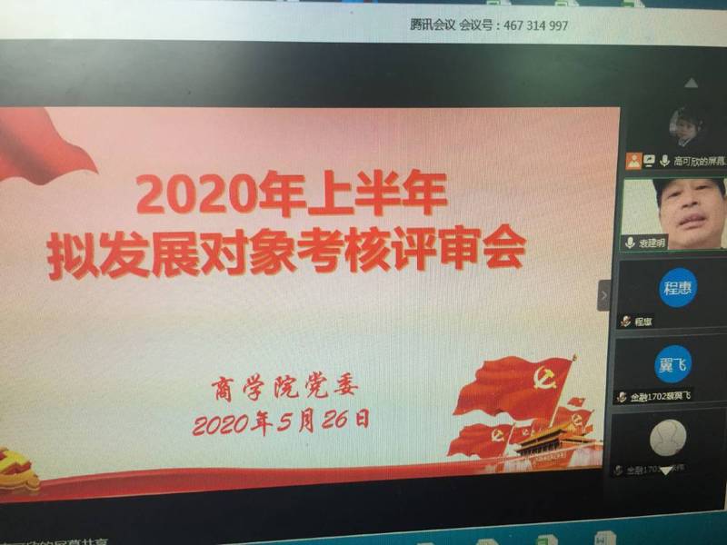 5月26日下午,为确保我院发展对象确定工作的规范有序,保证公平、公正、公开,根据《海角热点最新消息党委2020上半年发展对象确定实施方案》的具体安排,我院学生党支部在线上腾讯会议,召开了确定发展对象考核评审会。海角热点最新消息党委副书记袁建明、组织员阙庆喜、学生各支部委员、辅导员等确定发展对象领导小组成员及学生党支部拟发展对象72人参与会议。会议由学生第三党支部副书记高可欣主持。