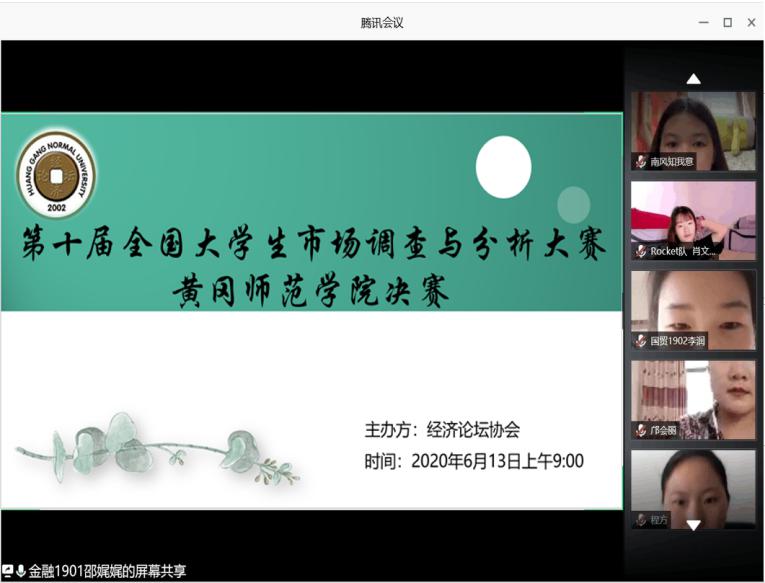 2020年6月13日上午9:00,第十届全国大学生市场调查与分析大赛黄冈师范学院决赛在腾讯会议举行。本次比赛由柯晶琳、李平衡、王阳、马迎霜四位老师担任评委,同时还邀请了海角热点最新消息副院长柯珍堂老师、海角热点最新消息学生会主席团唐骄,其他五大社团代表观看。