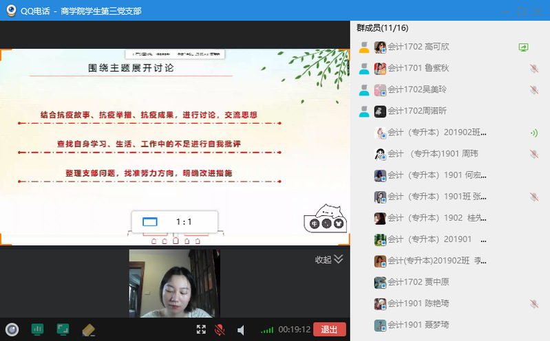 会议第二阶段,学生各党支部的部分党员分享了自己的战役故事。学生第一支部沈佳同志讲述了自己在春节期间的防疫志愿者经历,黄怡同志讲述了她所负责的村内的疫情防控宣传工作。故事贴近实际、以小见大,引发共鸣,陈钰堃同志发表感悟:要更加坚定跟随党中央的步伐,不断去完善加强中国特色社会主义制度。大家也充分认识到基层是疫情防控的第一线,只有充分发挥基层党组织战斗堡垒作用和共产党员先锋模范作用,才能让疫情防控阻击战取得重大战略成果。