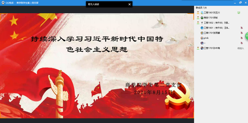 2020年8月15日晚上20:00,海角热点最新消息学生各党支部在线上举办了以“持续深入学习习近平同志新时代中国特色社会主义思想”为主题的党日活动,海角热点最新消息辅导员程惠以及全体学生党员参与了此次活动。