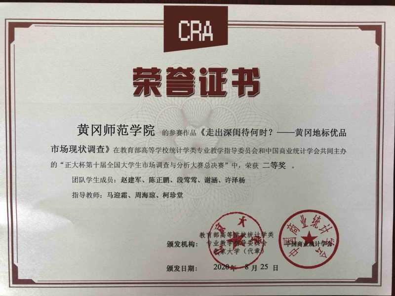 近日,由教育部高等学校统计学类专业教学指导委员会、中国商业统计学会共同主办的“正大杯”第十届全国大学生市场调查与分析大赛全国总决赛成绩正式公布。我校赵建军、陈正鹏、段莺莺、许泽杨和谢涵团队的《走出深闺待何时?——黄冈地标优品市场现状调查》荣获全国二等奖,这也是我校首次在此赛事中获得国家级二等奖。