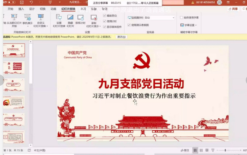 学生第一、三党支部活动采用线上形式开展,由学生第一支部纪检委员殷晓茹主持,学习内容以PPT形式展示。首先同志们一起重温了入党誓词,合唱国歌。然后殷晓茹带大家一起持续深入学习了习近平新时代中国特色社会主义思想,其中研读了《习近平谈治国理政》第三卷,引导广大党员读原著、学原文、悟原理,全面系统学、深入思考学、联系实际学,不断提高政治能力。随后殷晓茹向大家传达了习近平总书记在中央政治局第二十一次集体学习时的讲话精神,要毫不动摇坚持和完善党的领导、继续推进党的建设新的伟大工程,不断把党建设得更加坚强有力。最后,她传达了关于学习习近平总书记关于制止餐饮浪费行为的重要指示精神,鼓励党员同志们争做厉行节约的践行者、社会新风的引领者、传统美德的倡导者。