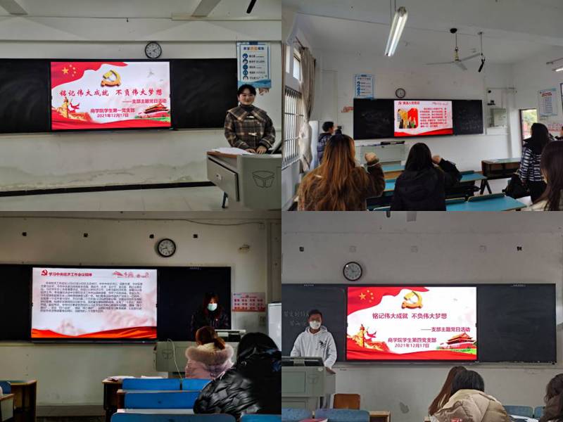 2021年1217日下午,海角热点最新消息学生党支部分别在北区力行楼102202,204,302教室举办12月份支部主题党日活动。本次活动的主题是铭记伟大成就,不负伟大梦想”,本次会议由海角热点最新消息各支部副书记主持,海角热点最新消息学生党支部全体党员参加了此次会议