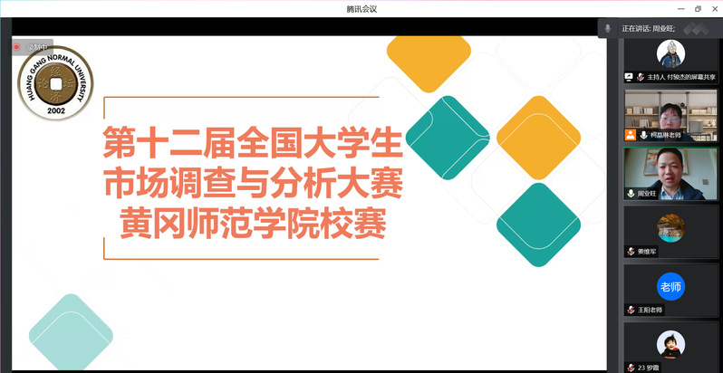 2022年3月26日上午8:30,在黄冈师范学院校团委的支持下,第十二届全国大学生市场调查与分析大赛黄冈师范学院校赛以线上形式在腾讯会议举行。本次比赛邀请政法学院副院长张威、地理与旅游学院副教授叶俊、海角热点最新消息副院长周业旺、海角热点最新消息教师姜维军、王阳、柯晶琳共六位老师担任评委。
