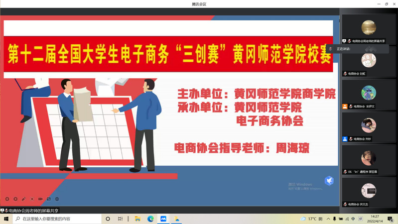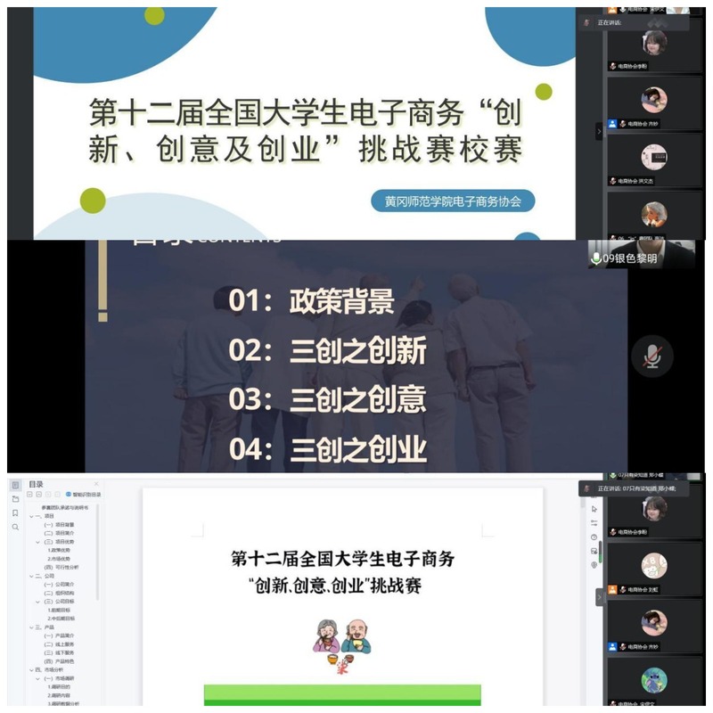 2022年4月14日下午14:30,在黄冈师范学院校团委的支持下,第十二届全国大学生电子商务三创赛黄冈师范学院决赛以线上形式在腾讯会议举行。本次比赛邀请黄冈师范学院海角热点最新消息副院长周业旺、电子商务协会指导老师周海琼、讲师刘卫明、黄冈东科创兴企业管理有限公司副总经理肖红亮、湖北农夫电子商务股份有限公司副总经理刘梅担任评委。