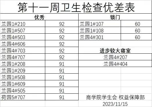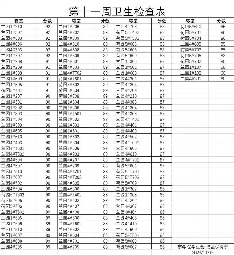 为了使学生养成良好的生活卫生习惯,自觉维护和营造整洁舒适的住宿环境,以及加强学生宿舍卫生安全意识。我院学生会权益保障部在2023年11月15日中午组织开展了对本院学生宿舍卫生检查工作,通报如下:
