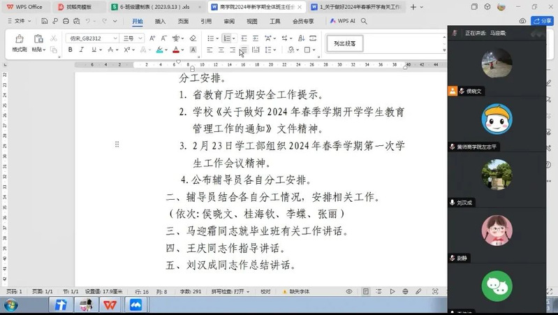 为做好2024年春季学期开学学生安全返校工作,我院在2024年2月23日(正月十四)下午4:00召开了2024年春季学期第一次班主任、辅导员工作会议。院党委书记刘汉成、院长王庆、副院长马迎霜出席会议,全体辅导员、班主任参加会议,副书记李传坤出席并主持会议。因低温雨雪冰冻天气,会议以视频方式召开。