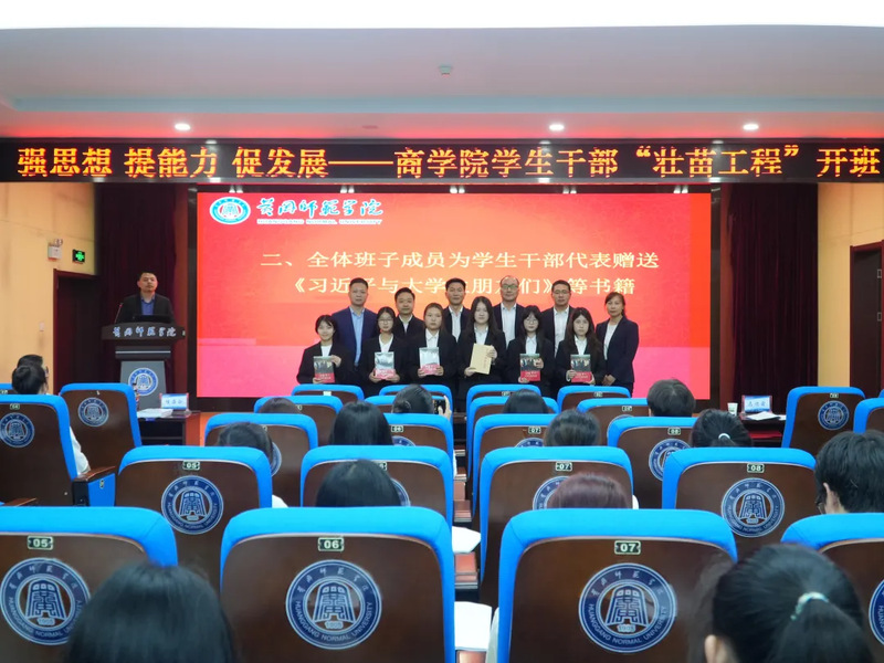 院党委书记刘汉成、院长王庆,院党委副书记李传坤、副院长周业旺、马迎霜,党政办公室主任何秀平为学生干部代表赠送《习近平与大学生朋友们》等书籍并合影。