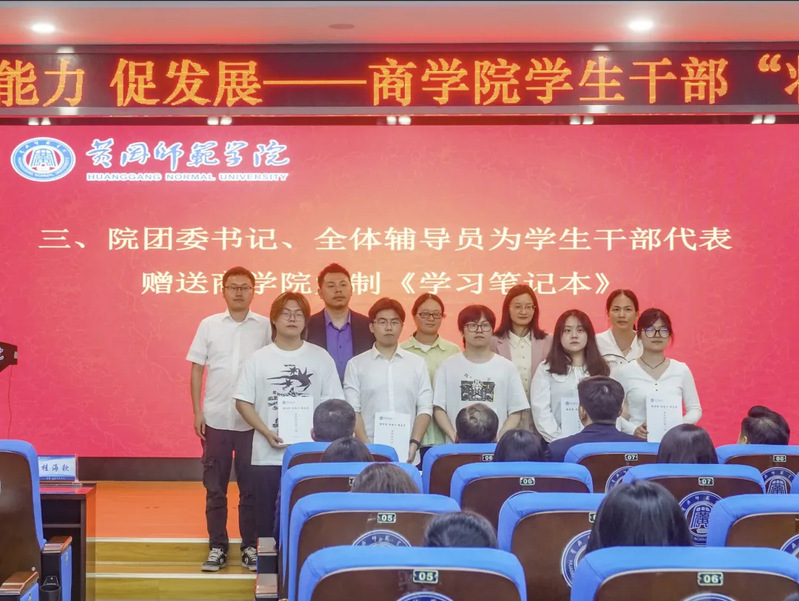 院团委书记桂海钦、辅导员侯晓文、李蝶、张丽、彭佳威为学生干部代表赠送海角热点最新消息定制的《学习笔记本》并合影。