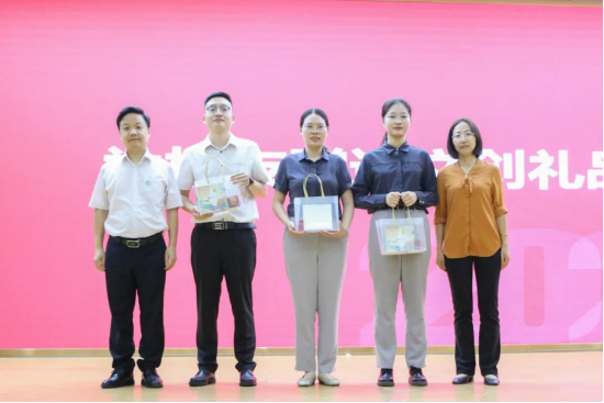 许春妮和李传坤为曹煌、高莉、程莉君三位校友颁发我校文创纪念品,并合影。