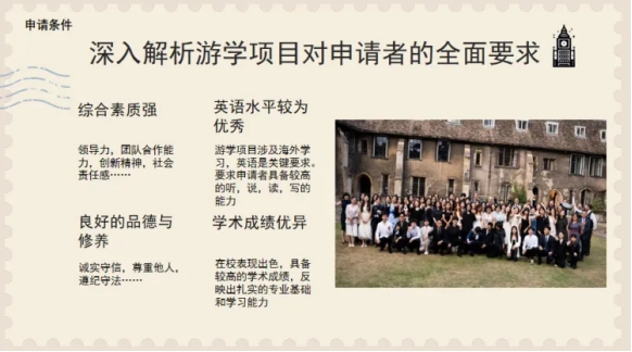 最后,庞林峰学姐为即将踏上大学新征程的学弟学妹们揭秘了游学项目的申请条件,并鼓励她们不断提升自我,为申请游学项目做好充分准备。她表示,游学申请是一个全面考察申请者综合素质的过程,希望每一位怀揣梦想、勇于挑战的学弟学妹们都能在未来的日子里实现自我超越。