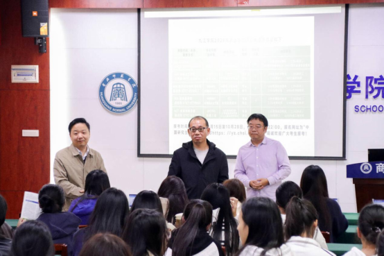 院党委副书记李传坤主持宣讲会并简要介绍了学院近年来考研情况,辅导员李蝶和学院部分国贸专业学生在致远楼704会议室参加会议。