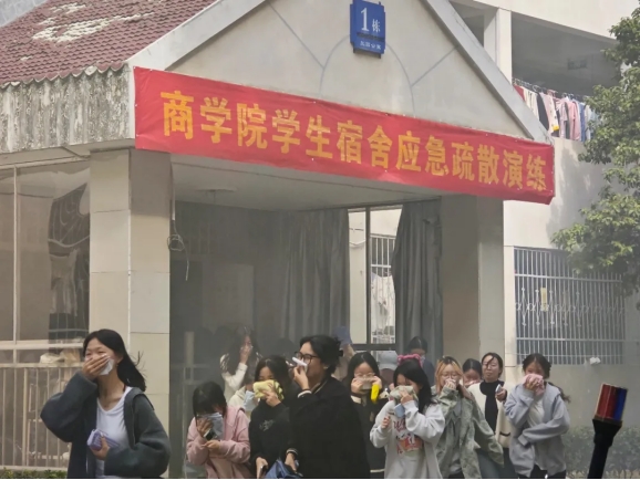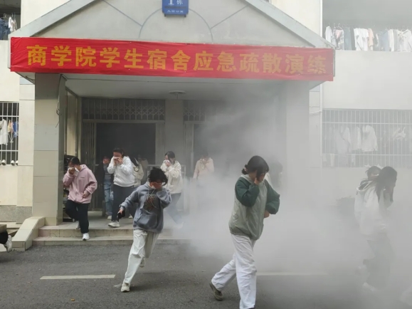 本次演练通过烟雾弹模拟火灾环境,让同学们亲身感受火灾场景。随着哨声和喇叭预警声响起,在浓烟四起中开始。面对突发警报、浓烟滚滚,同学们也没有惊慌失措。而是有条不紊地用湿毛巾捂着鼻子、弓着身子一次离开寝室,排成一列纵队,在老师指挥下按照指定逃生路线迅速从宿舍撤离到了安全的空旷场地。全体同学沉着冷静、互相合作,一切行动听指挥,在演练过程中做到了不慌乱、不拥挤。