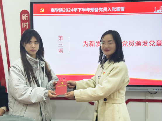 第三项,李蝶同志为新发展预备党员颁发党章,这一时刻充满了庄重与期待。