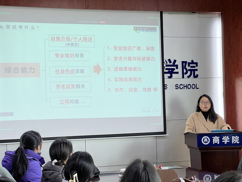 周爱玲老师为同学们考研英语复试进行了专题辅导,详细介绍了从开场问候、自我介绍,到专业知识问答、综合素养考察等各个环节的注意事项,并现场与同学们进行了互动,为同学们增添了信心和力量。