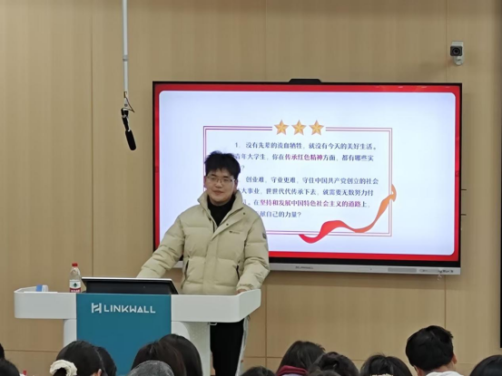 授课过程中,李传坤副书记结合自身经历与工作实践,对学员们提出三点期望:一是要坚定理想信念,以党的理论武装头脑,始终保持政治上的清醒与坚定;二是要牢记党的宗旨,将“人民至上” 理念融入学习与生活,主动服务他人、奉献社会;三是要锤炼过硬本领,立足专业学习,将个人成长融入国家发展大局,以实际行动践行初心使命。