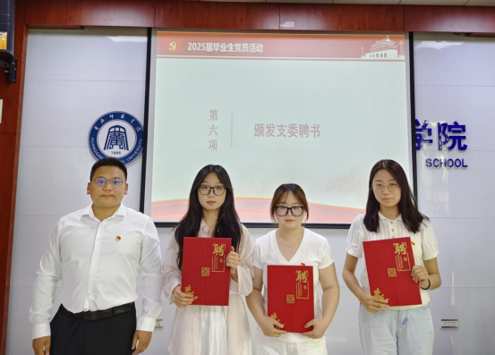 随后,四位学生党支部书记分别为受聘支委颁发聘书并合影留念,希望他们离校后继续发挥先锋模范作用和校友间的桥梁纽带作用。