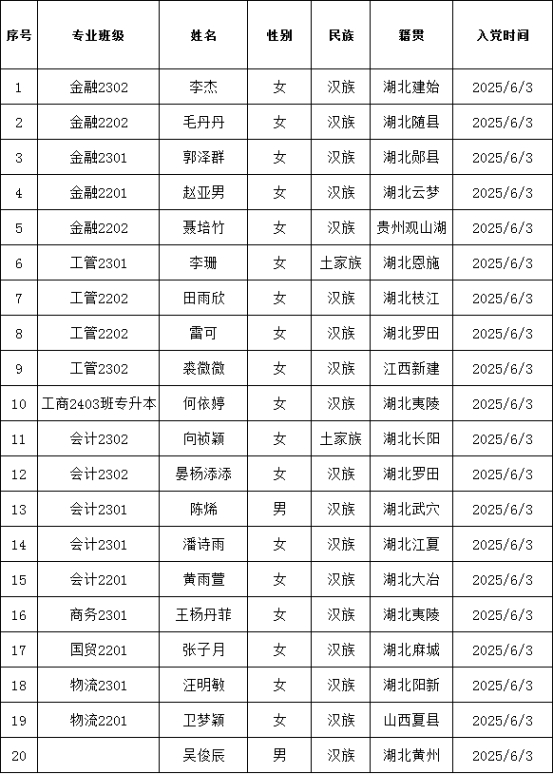 根据发展党员工作有关规定,李杰等20名同志政审、预审、联审合格,海角热点最新消息各党支部于2025年06月03日召开支部大会讨论接收为中共预备党员。现将其有关情况公示如下:![]()